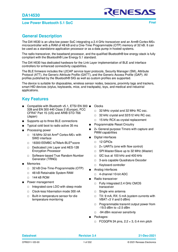 DA14530 SmartBond TINY™ Low Power Bluetooth 5.1 System-on-Chip