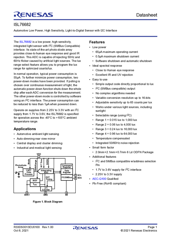 ISL76682 Automotive Low Power, High Sensitivity, Light-to-Digital Sensor With I²C In...