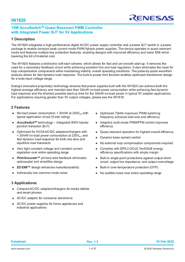 iW1820 15W AccuSwitch™ AC/DC Digital Primary-Side Switcher Eliminates Optocoupler...
