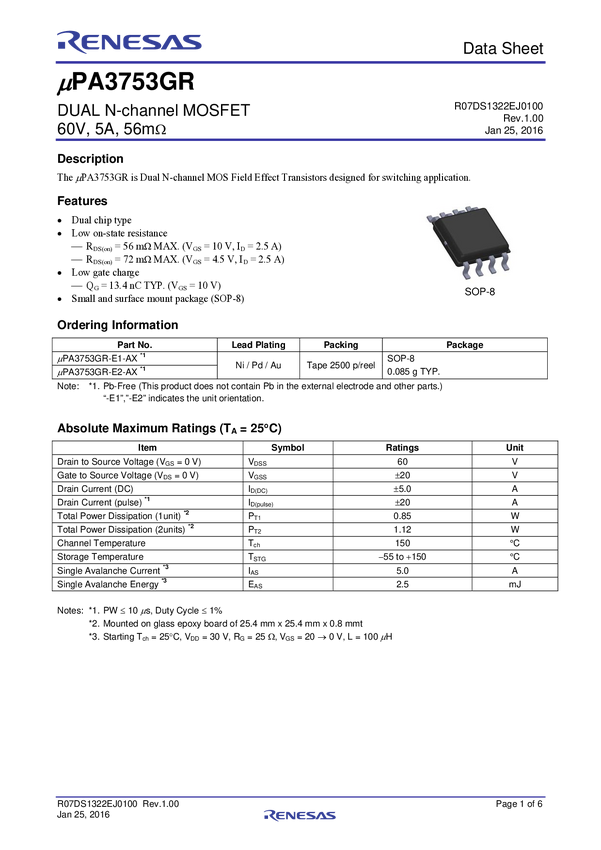 UPA3753GR Nch Dual Power MOSFET 60V 5A 56mohm SOP-8 / SOIC-8