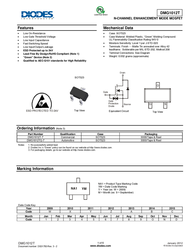 Tranzystor; DMG1012TQ-7; N-MOSFET; 0,45A; 20V; 0,28W; 0,3Ohm; unipolarny; SOT523-3; SMD; DIODES INCORPORATED; RoHS; opakowanie/100szt