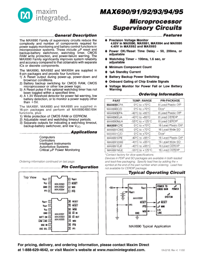 MAX690, MAX691, MAX692, MAX693, MAX694, MAX695 Microprocessor Supervisory Circuits