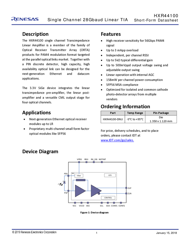 HXR44100 Single Channel 28Gbaud Linear TIA 10Km