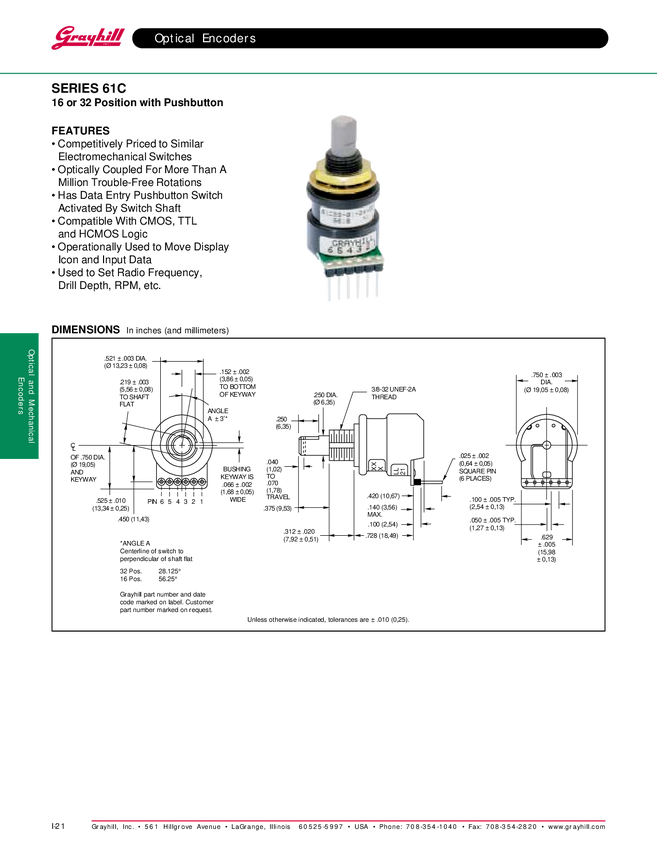 GRAYHILL 61C11-01-08-02 Incremental Rotary Encoder, Optical, with pushbutton, 16,6 R PM, 11 detents...