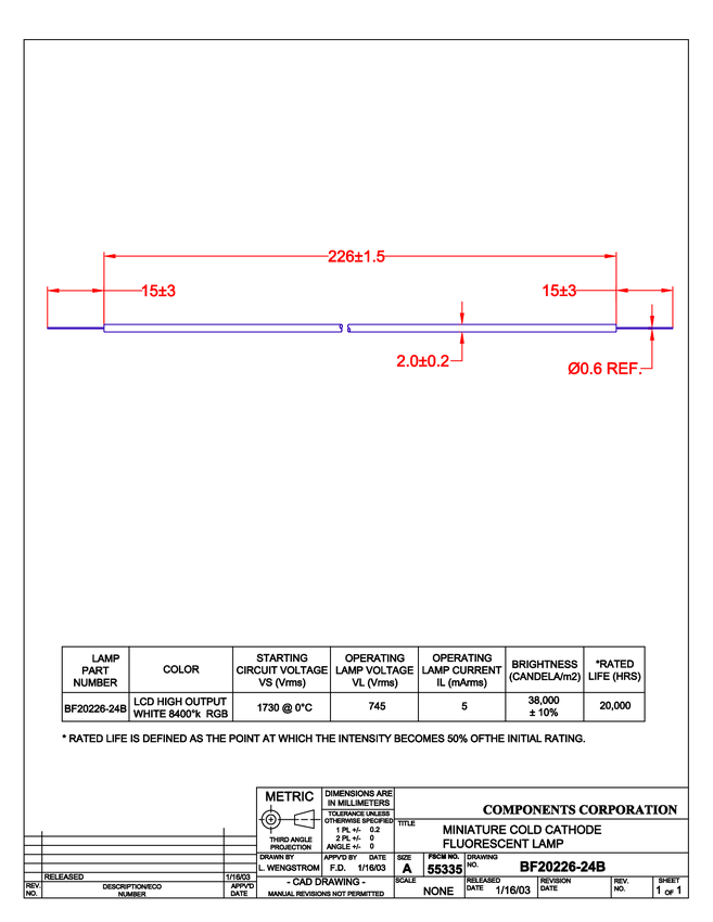 CCFL-BF20226-24B Lampa CCFL 2,0 mm x 226 mm (1275 V ) 1730 Vstart 745 V operating Temperatur...