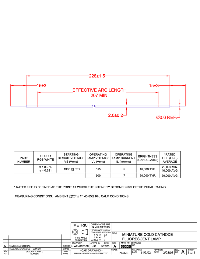 Lampa CCFL; 1300 V; średnica 2.0mm x 228 mm Start volt.1300 V ; zasilanie lampy 515 V ; prąd 5 mA color RGB WHITE; Temperatura barwowa 6700 K