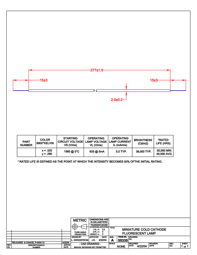 Lampa CCFL; 1560 V; średnica 2.0mm x 277 mm Start volt.1560 V; zasilanie lampy 625V; prąd 5 mA Color-temperatura barwowa 6900K