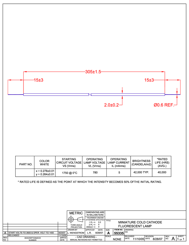Lampa CCFL; 1200 V; średnica 2.0mm x 305 mm Start volt.1013V ; zasilanie lampy 695V ; prąd 5 mA COLOR WHITE; Temperatura barwowa 8810K