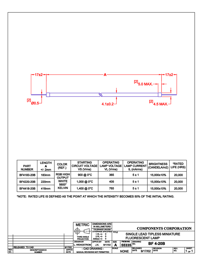 Lampa CCFL średnica 4,1 mm ; długość 183mm; start.volt. 900 V; zasilanie lampy 365 V; prąd 5 mA; jasność 16.000 Cd./m2 Temperatura barwowa 5100 K - 5716 K