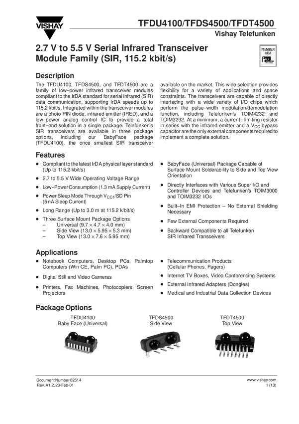 TFDS4500 IrDA-Transceiver 2,4...115,2kbit/s nieprodukowany, proponujemy TFDS6502