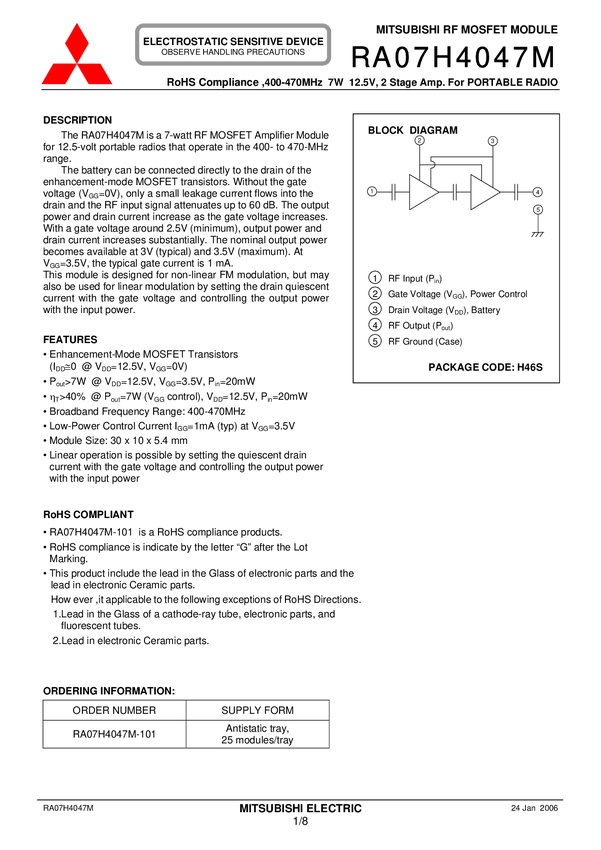 RA07H4047M-101 Mosfet module 400-470MHz 7W 12,5V 2 stage Amp