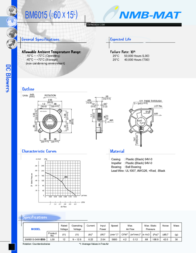 KDE1206 BM6015-04W-B59L00 Wentylator typu Blower 60x60x15mm 12V DC (9-12,6V DC) I=0,22 A; 2,64W; Lock...
