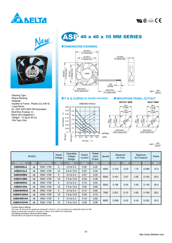 Wentylator 12V, 40x40x10mm; łożysko ślizgowe, poziom hałasu 29,5dB; 7000 RPM; 0,72W; 7-13,8V DC prąd I=0,04 A; moc P=0,5 W Wentylator Delta