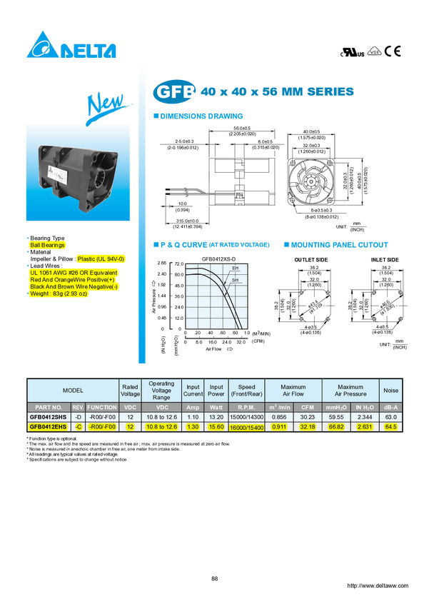 KDE1204 GFB0412EHS-C 40x40x56mm Ball 1,3A 12V DC 15,6W noice 64,5dBA (8)3" with connector; widok...