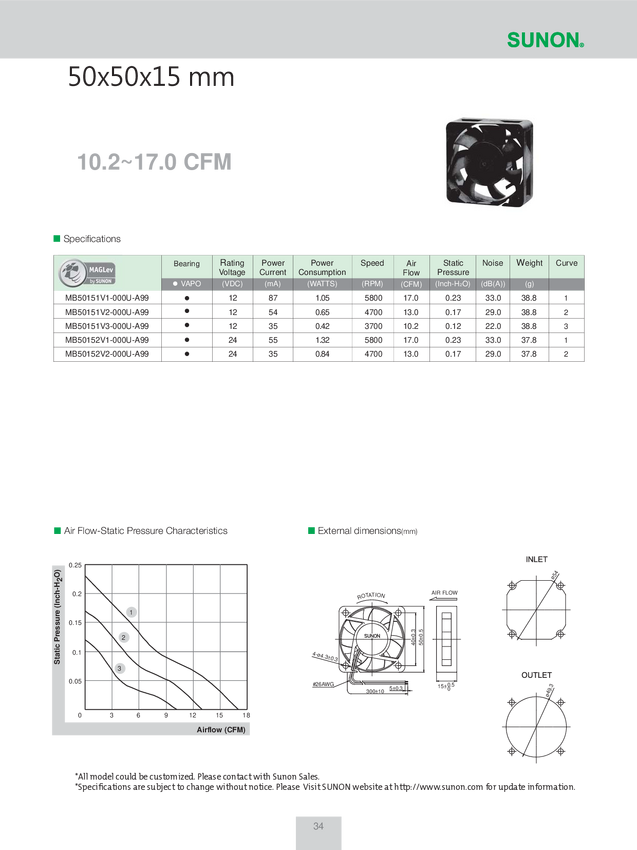 KDE1205 MB50151V2-A99 Wentylator sunon 12 V DC 54 mA 0,65 W 4700 RPM 29 dBA 50x50x15 mm