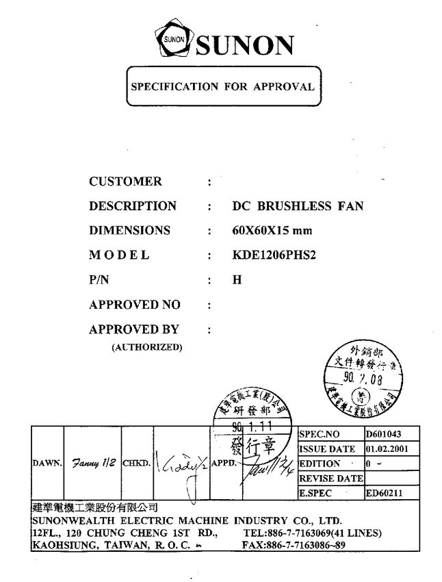 Wentylator 12V, 60x60x15mm, łożysko VAPO (magnetyczne), wydajność 35,67m3/h; poziom hałasu 36dB; prąd I=0,13 A; moc P=1,6 W Nieprodukowane, proponuję podobne KDE1206PHS2