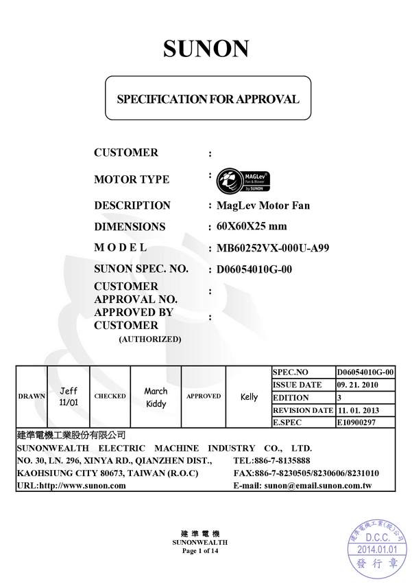 Wentylator 60x60x25mm 24 V DC prąd 0,11 A max0,127 A Moc 2,64W / 3,05 W 24 V DC - 8-27,6 V DC starting Voltage 8 V DC 5200 RPM 36,5 dBA trwałóość 70.000 godzin przy 40 stopniach dwu kabelkowy ; kabelek 26AWG dł. 300 mm Nadruk MB60252VX-000U-A99