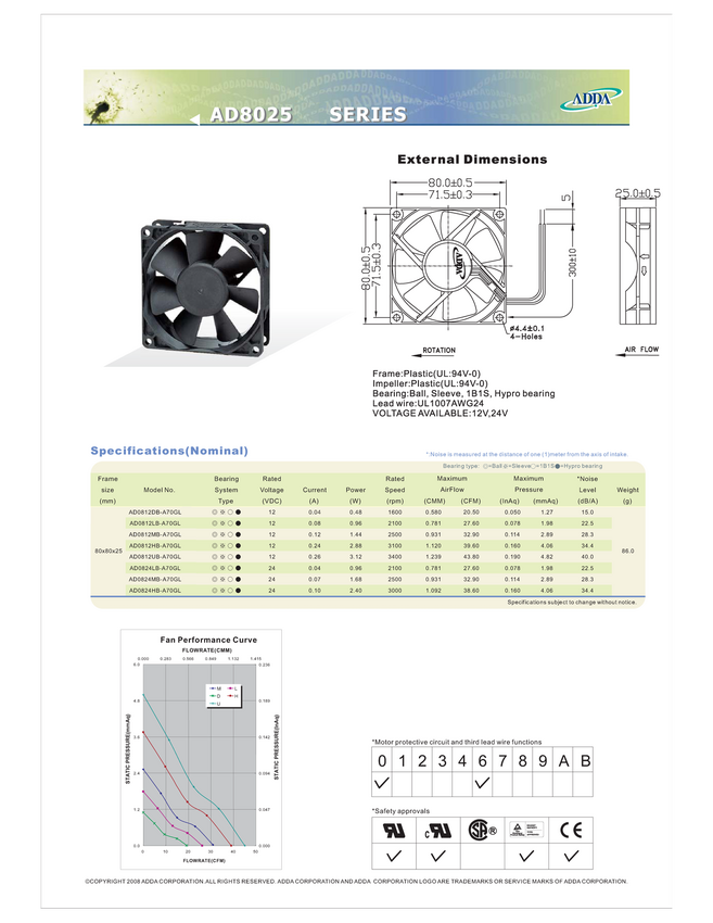KDE1208 AD0812HB-A70GL Wentylator osiowy; seria ADDA AD8025; 80 x80 x 25mm; 12V DC 1,093 m3/min 35...
