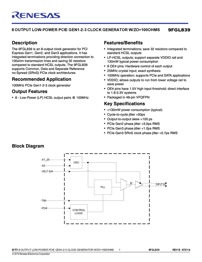 9FGL839 8-Output 3.3 V PCIe Gen 1-2-3 Clock Generator with Zo = 100 ohms