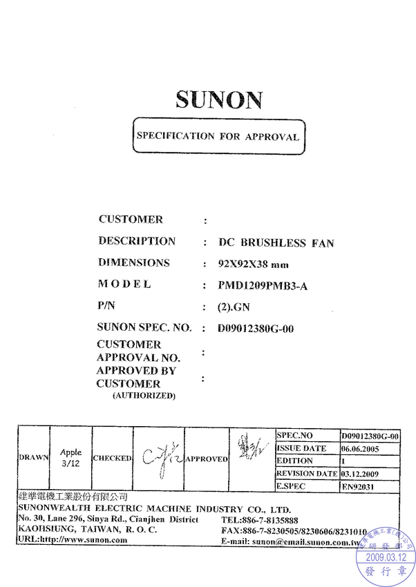 PMD1209PMB1A Wentylator 12V, 92x92x38mm, łożysko kulkowe, wydajność 204,17m3/h; poziom h...