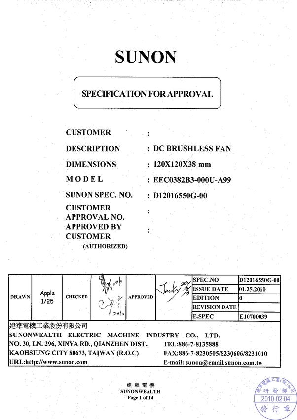 Wentylator 120x120x38 mm; łożysko kulkowe 24V (6-27,6V); DC24V 3,1W 157,97 m3/h; 37dBA; I-0,13A; P=3,1W; 2100RPM łożysko kulkowe; Prąd130 mA / Max 150 mA Rated Power Consumption 3,1 W / Max.3,59 W Operating voltage 10-27,6 Vv DC Starting Voltage 10 V D -10+70 stopni 2100 RPM Life 70.000 ours at 40 deg Polarity protection Automatic restart Kabelki 2 długoś 300 mm 24 AWG czarny i czerwony 37dBA