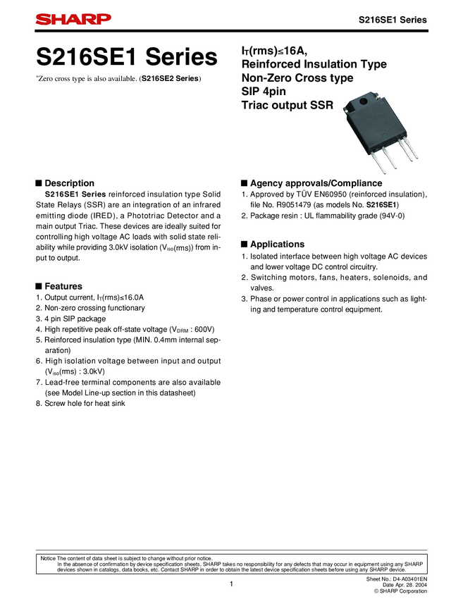 S216SE1 SSR 16A, SIP4 ; bez układu zero cross proponujemy s216s01 lub s216s01f (to...