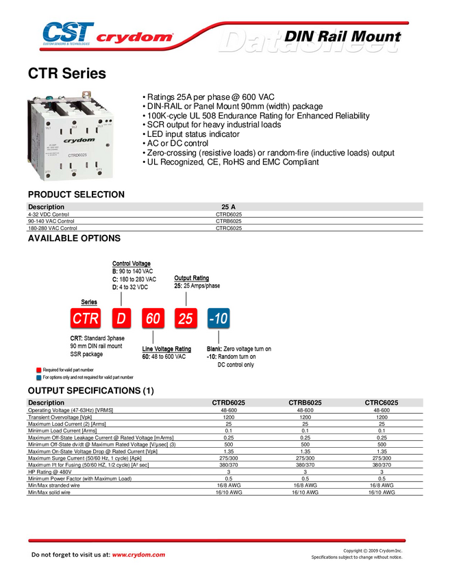 CTRD6025-10 CRYDOM Przekażnik 3 fazowy na szynę DIN 3 x 600V 25A; wersja R (Random); sterowani...