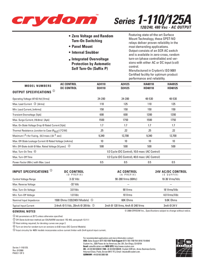HD48125 CRYDOM Przekaźnik elektroniczny SSR Solid State Relay, Load Current 0,04-125A RMS,...