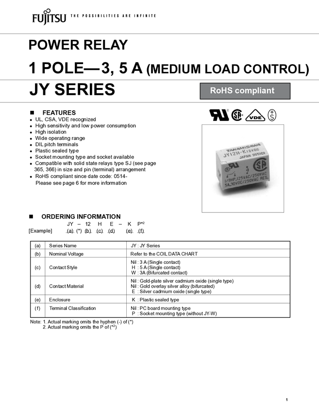 JY12H-K Przekaźnik Takamisawa 12V DC; SPST-NO Styki Gold-plate silver cadmium oxide...