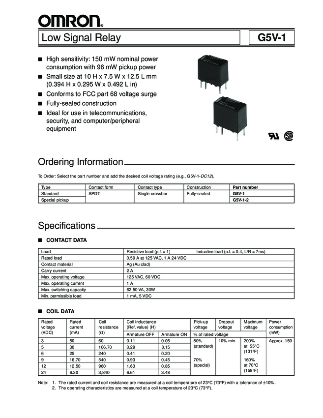 Przekaźnik OMRON PCB, SPDT, prąd znamion.1A, 12,5x6,5x10mm SPDT 5V 167R, seria G5V1