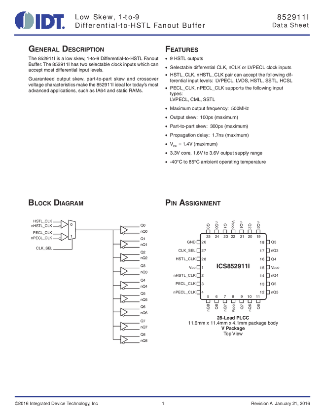 852911I Low Skew,1-to-9 Differential-to-HSTL Fanout Buffer