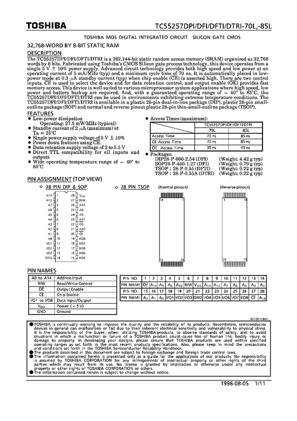 TC55257DPI-85L CMOS SRAM 5V 32KX8 DIP28 -40+85 CELC TOSHIBA Standby 0,3uA max 2uA; Operati...