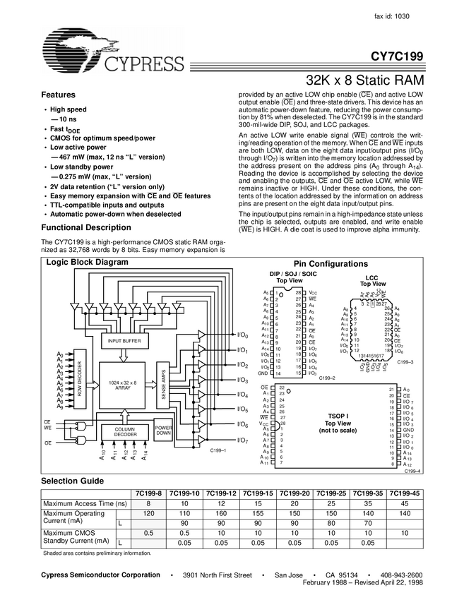 CY7C199-15VI CMOS SRAM 32KX8 15NS 28LEAD MOLDED SOJ300MILS-40+85 odpowiednik dla AS7C256...