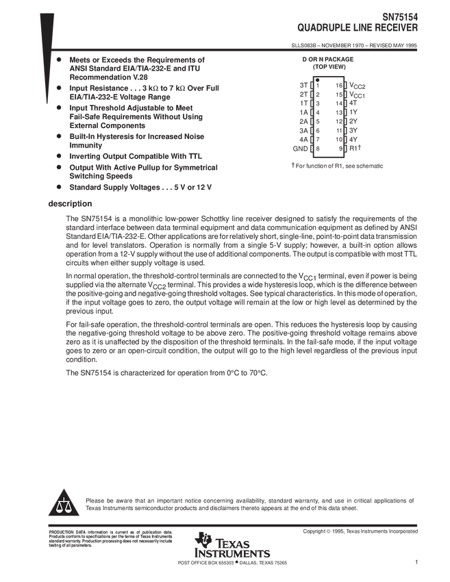 SN75154N/DS75154N QUAD LINE RECEIVER V24/RS232C DIP16