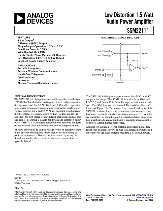 SSM2211P ULTRALOW NOICE&DISTORTIPON 1W POWER AMP
