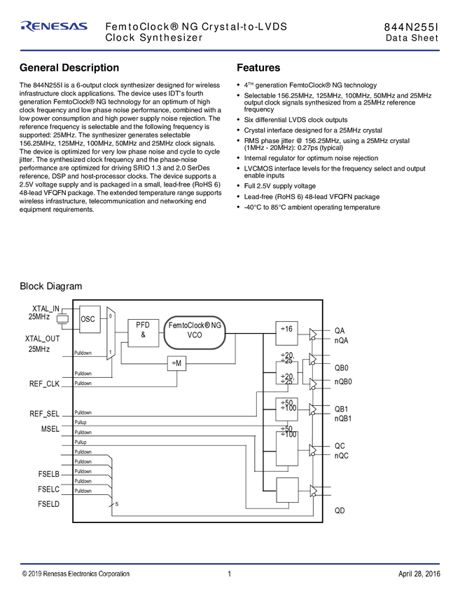 844N255I FemtoClock NG Crystal-to-LVDS Clock Synthesizer