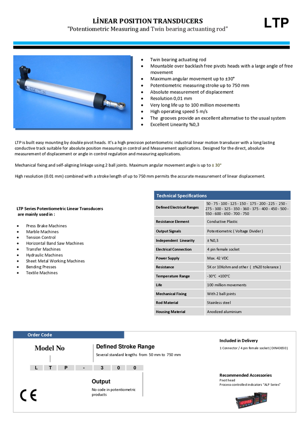 Potencjometr liniowy przewodzący plastik - dzielnik napięcia dwa przeguby, z boku złącze; średnica ok.36mm; pomiar 250 mm; mechaniczy 254 mm; długość korpusu 354 mm; długośc między środkami przegubów 422mm; Rezystancja 5 kohm; Liniowość +-0,3%; trwałość 100 mil.cykli