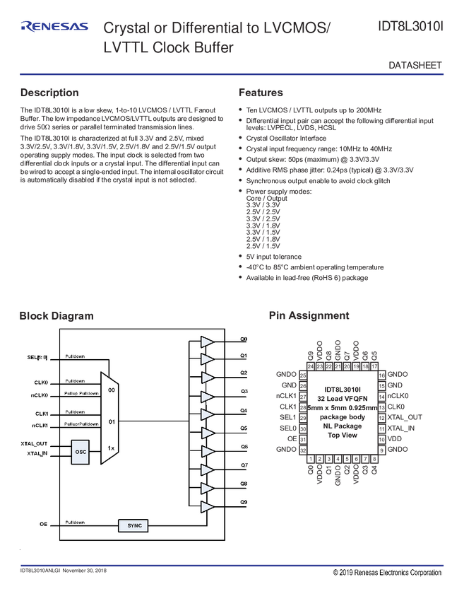 8L3010I Crystal Or Differential to LVCMOS/LVTTL Clock Buffer