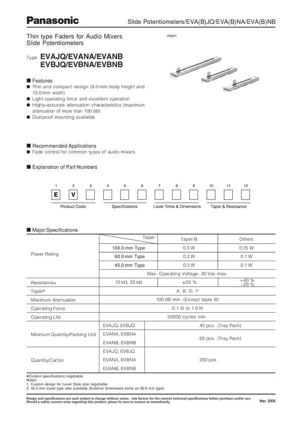 PMEVBNADR15A14 A103X2 Potencjometr suwakowy Panasonic, 10 kohm; stereo - dual Travel 60mm; 88mm x...