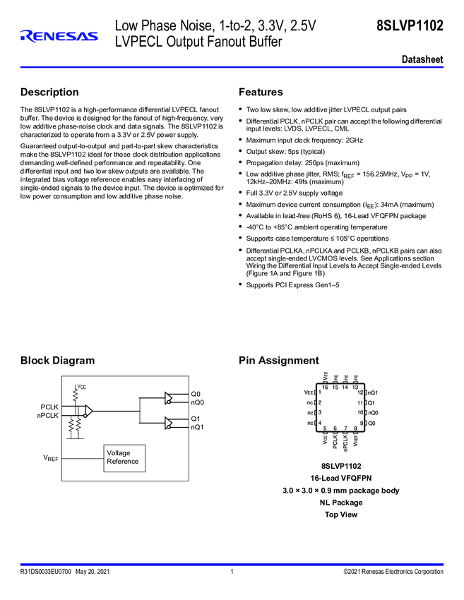 8SLVP1102 1:2 LVPECL Output Fanout Buffer