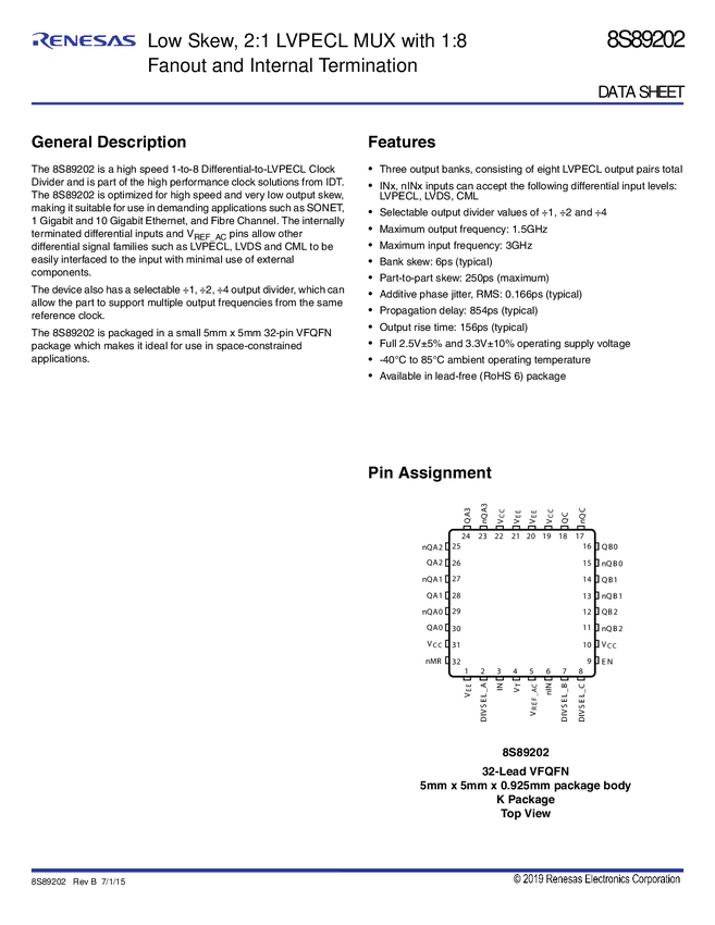 8S89202I Low Skew,2:1 LVPECL MUX With 1:8 Fanout And Internal Termination