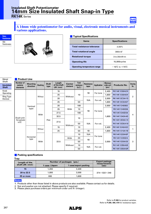 Potencjometr 14mm; 7 pin; Podwójny; rys 2 ; Vertical Type ośka 6mm FL; LM1=15mm ; Rez. 10 kohm; charakterystyka liniowa 1B for Tone ; tol.20%;kąt.300st; trw.15.000 cykli; RK14K1230A2X