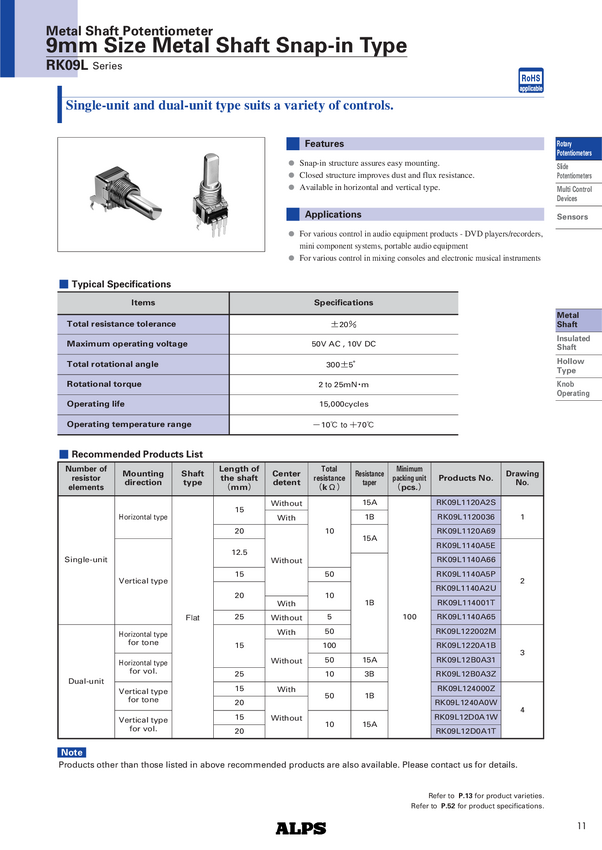PMRK09L124000Z 2G B503 Potencjometr mono leżący 15 mm, 10 kohm, 1B - liniowy Alps podaje dł.ośki j...