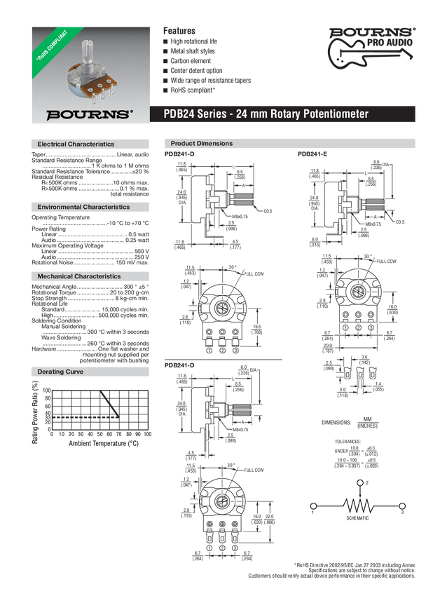 Potencjometr "gitarowy" Bushing średnica 24 mm gł. 11,8mm Ośka 6,35mm okrągła dł. 19 mm trwałość 15.000 cykli końcówki zagięte do tyłu - łezka; 0,25W charakterystyka liniowa B0; rezystancja 100 kohm