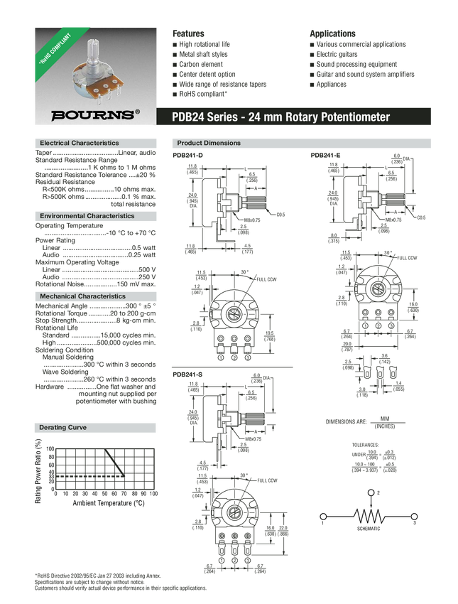 Potencjometr węglowy 24mm; bushing; tol. 20%; do gitar ośka okrągła lub ścięta lub knurled-ząbkowana 6mm, dł.20mm; średnica 24mm, gł. 11,4mm; moc. A-log- 0,25W; B-log 0,5W; trwałość 15.000 cykli Rezystancje: 1k-1M