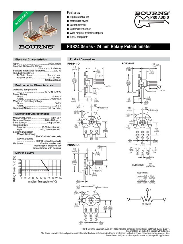 Potencjometr "gitarowy" Bushing średnica 24 mm gł. 11,8mm Ośka 6mm knurled (ząbkowana) dł. 19 mm trwałość 15.000 cykli końcówki zagięte do tyłu - łezka; bez zapadek; 0,25W charakterystyka logarytmiczna A2; rezystancja 250 kohm