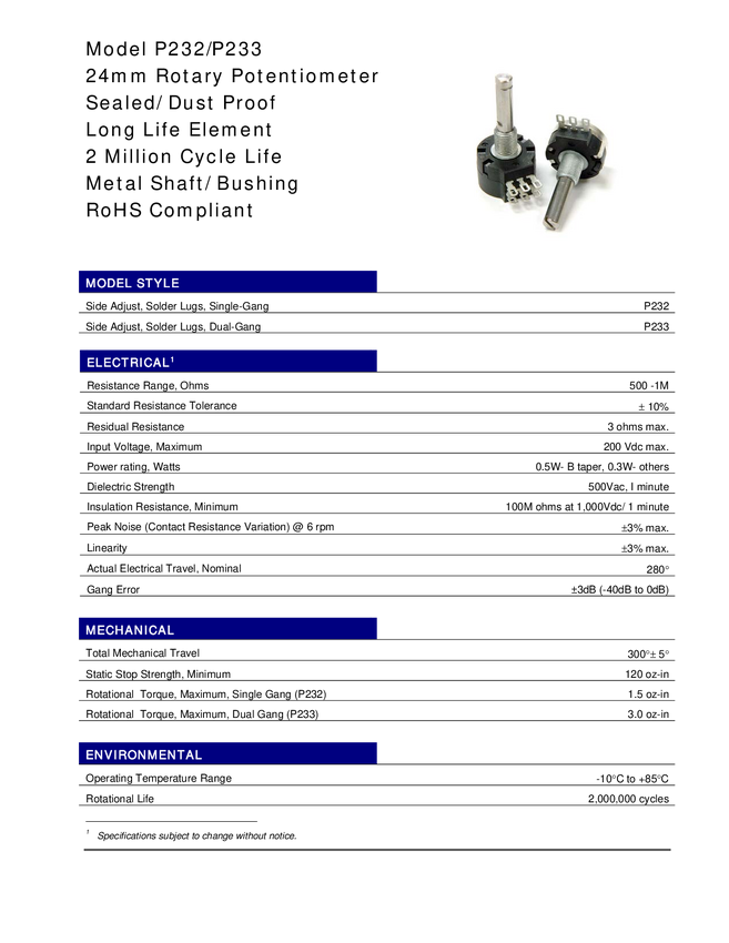 24mm gł 11,5mm obrotowy; Bushing M9xP0,75; 2M cykli; tol 10% ośka okr.lub ścięta 6,35mm; B-lin.0,5W; A-log-0,3W; kąt el 280 st; kąt mech 300 st; Produkowane rez. 500-1M;mono