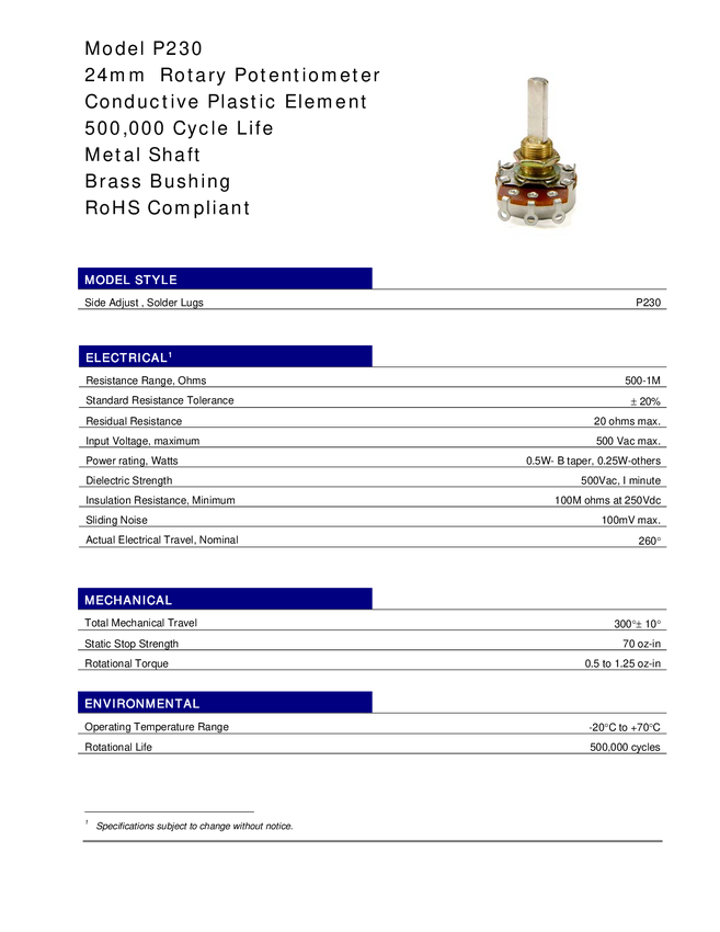 Potencjometr 24 mm; przew plastyk, trwałość 500.000 cykli ośka okr.lub ścięta 6,35mm Bushing 3/8-32 unef, łezka do lut B-liniowy 0,5W; A-log 0,25W; kąt el.260 st; kąt mech 300 st. produkowane rez. 500-1M; tol 20%