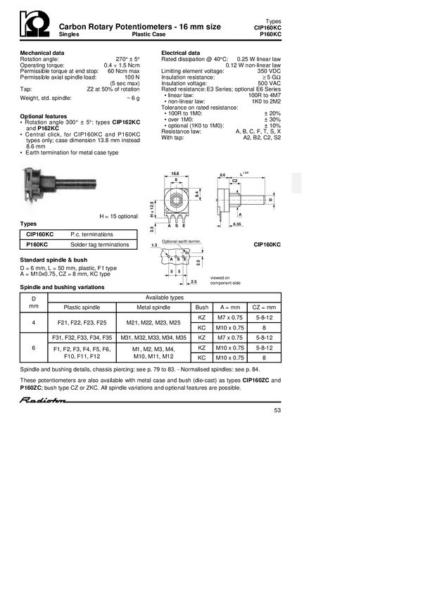 Potencjometr węglowy Radiohm logarytmiczny Bushing M10x0,75 ośka 6mm, dł. 50mm plastyk, szer. 16,8mm, wys. 20,9mm + piny 3,6 mm, raster pinów 5mm; kąt 270 stopni; 0,12W; tol. 20% Rezystancja 4,7 kohm Minimalna ilość 10 sztuk, sprzedajemy tylko jako wielokrotność 10 sztuk