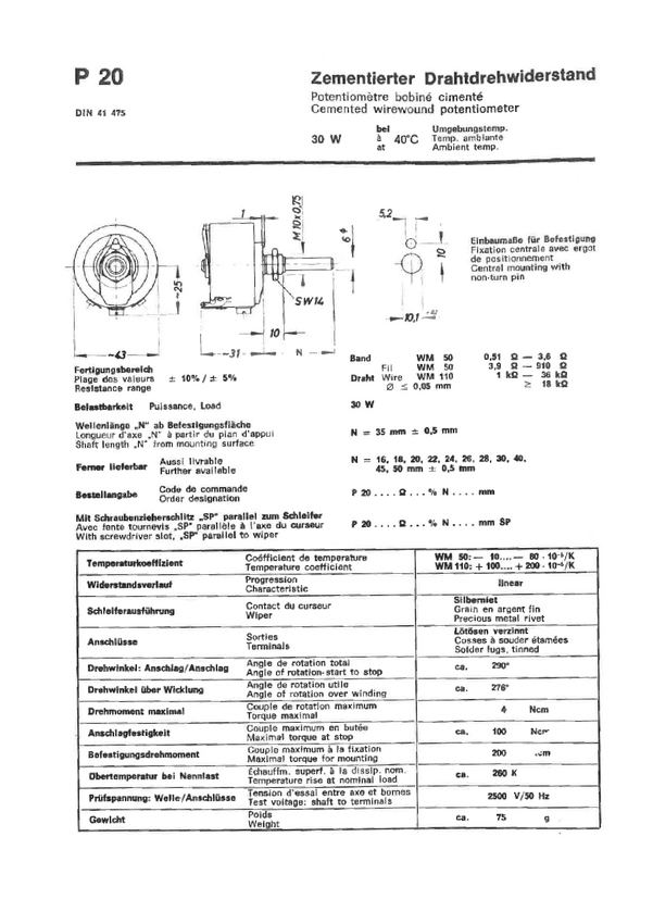 Potencjometr drutowy, 30W; Tolerancja 10%; Kąt pracy 290 sto pni; średnics 43 mm; głębokość 31mm; ośka 6,00mm dł. 35 mm liczona łącznie z gwintem M10x0,75 o dł. ok.10mm; Drut nawinięty na karkasie cementowym niezabudowanym; wyprowadzeni a z boku; Potencjometr ten powinien pracować jako dzielnik napięci a ( trzy końcówkowo ); nie jest przystosowany do pracy w funkcji reostatu - dzielnika prądu